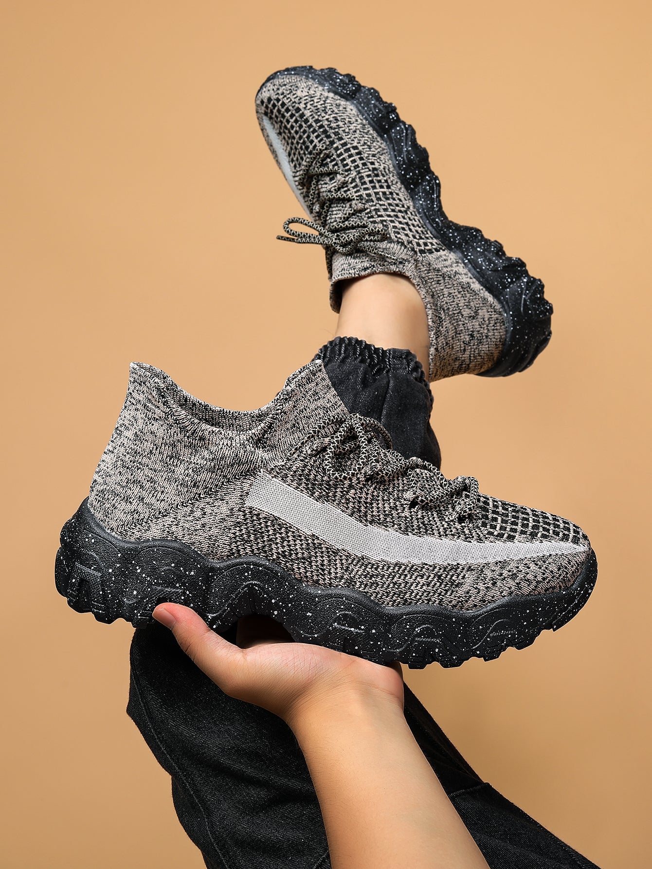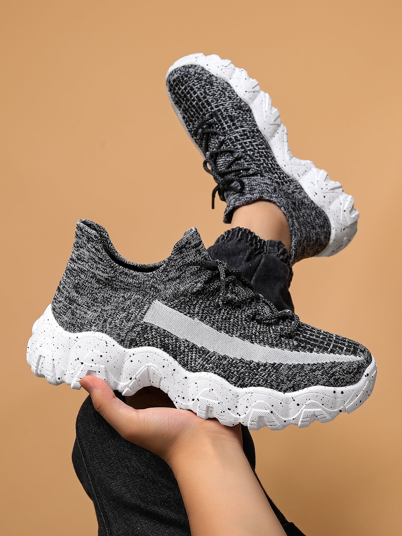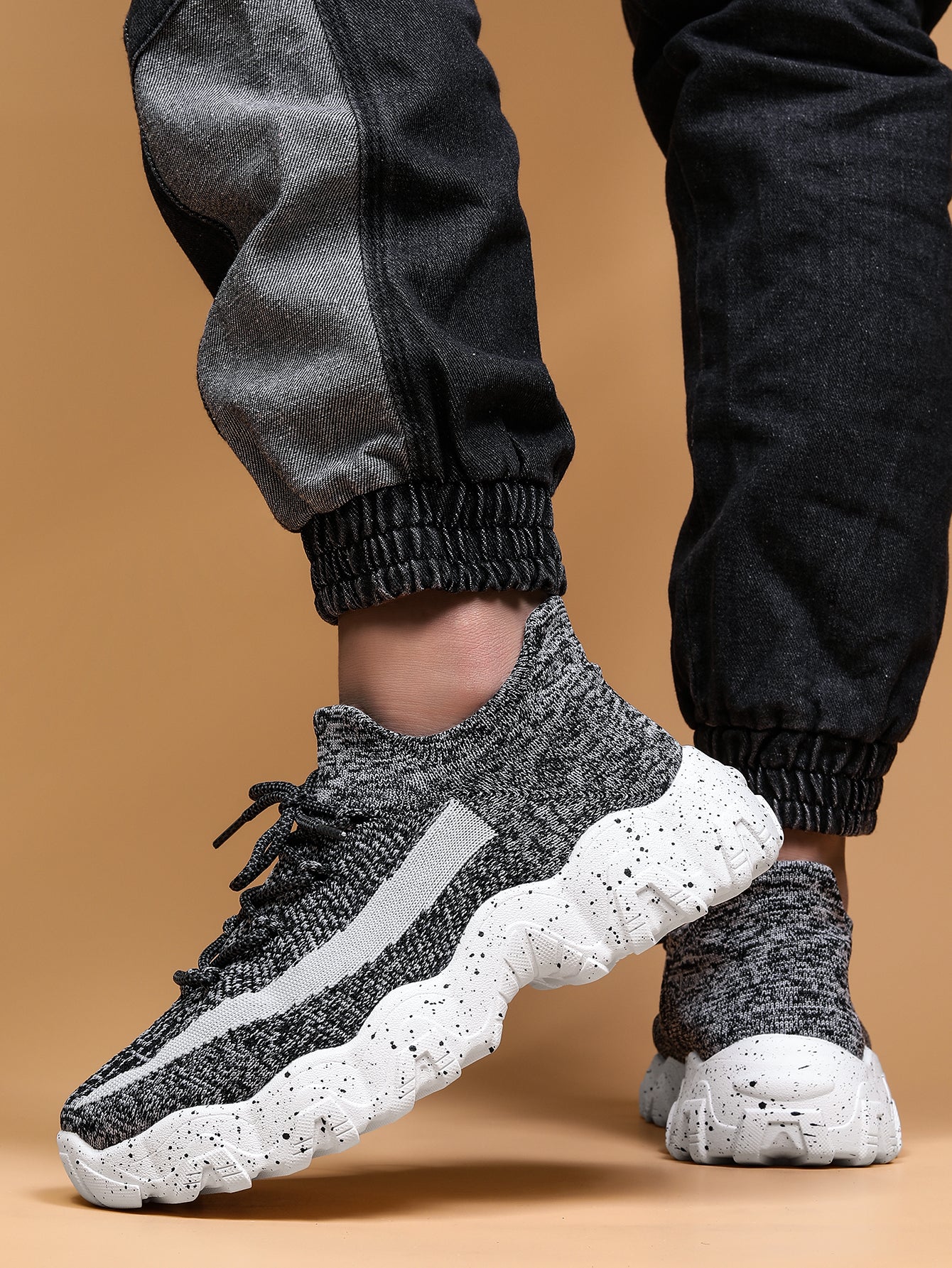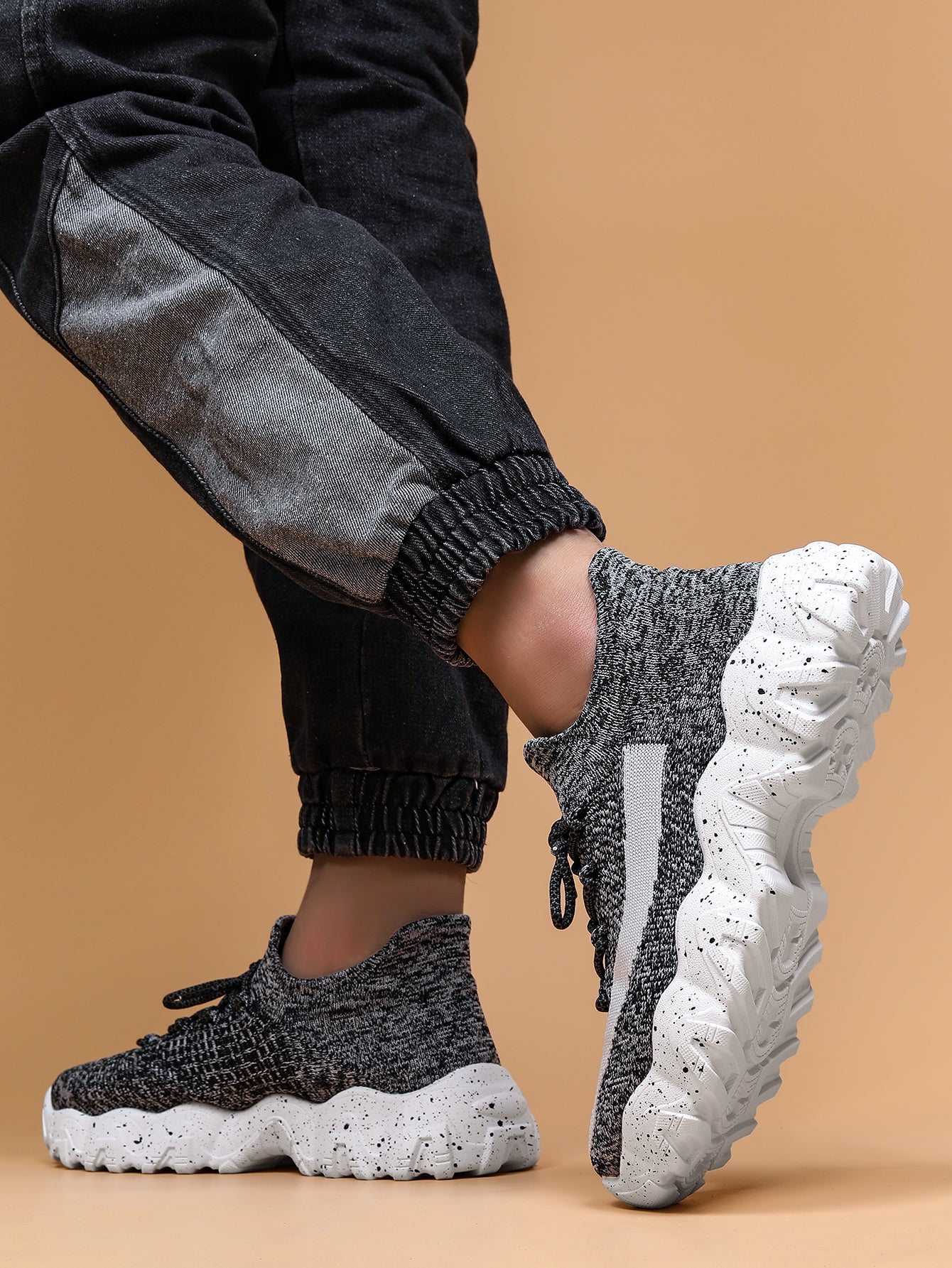 Chunky soles splattered like paint across pavement meet knit uppers woven for breathability and bold texture. These street beasts grip hard, flex easy, and keep your stride fierce from first step to finish line.